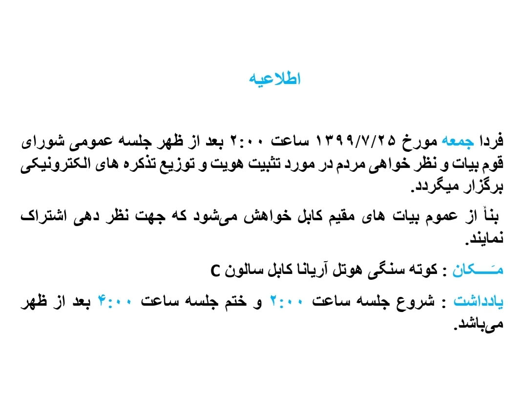 فردا جمعه مورخ ۲۵/۷/۱۳۹۹ ساعت ۲:۰۰ بعد از ظهر جلسه عمومی شورای قوم بیات و نظر خواهی مردم در مورد تثبیت هویت و توزیع تذکره های الکترونیکی برگز...